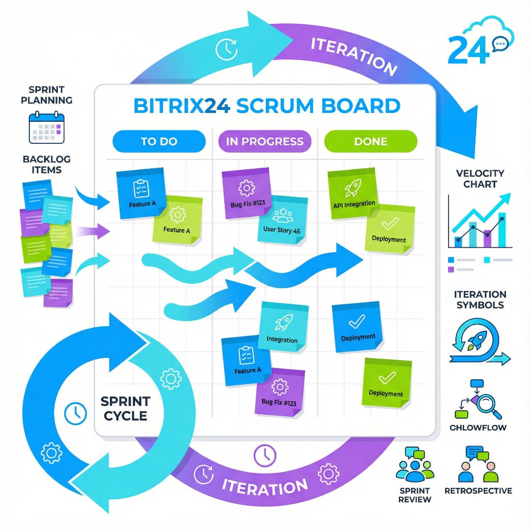 - Внедрение методологии управления проектами (например, Scrum, Kanban) средствами Битрикс24.
